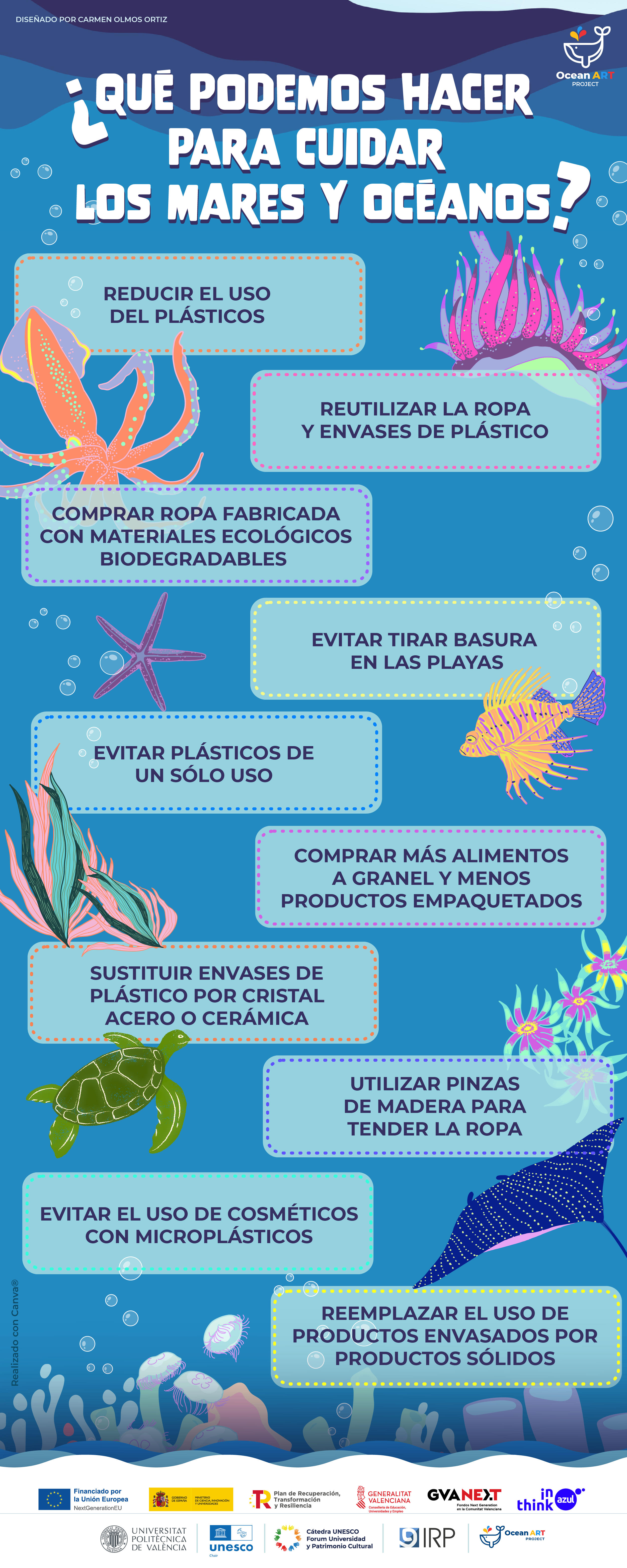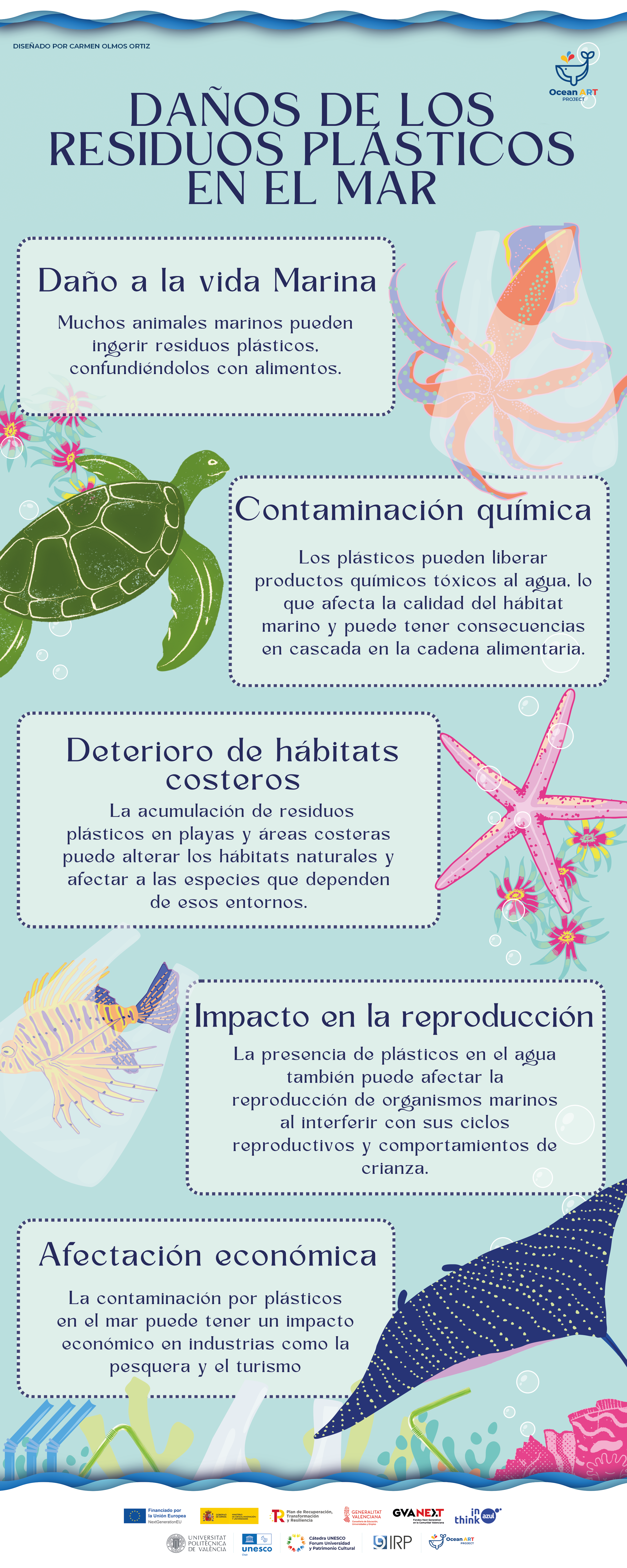 Los pósteres de Ocean Art Project no solo celebran la riqueza cultural y natural del entorno marino, sino que también destacan los peligros que enfrentan, desde la contaminación por plásticos hasta la sobrepesca y el cambio climático. Al utilizar el patrimonio cultural marino como punto de partida, invitamos a niños, niñas y jóvenes a explorar la diversidad de vida que habita en nuestros océanos, así como a reflexionar sobre cómo sus acciones diarias pueden marcar la diferencia en la protección de estos ecosistemas vitales. Nuestros pósteres no solo son una fuente de información, sino también una invitación a la acción y la conservación.